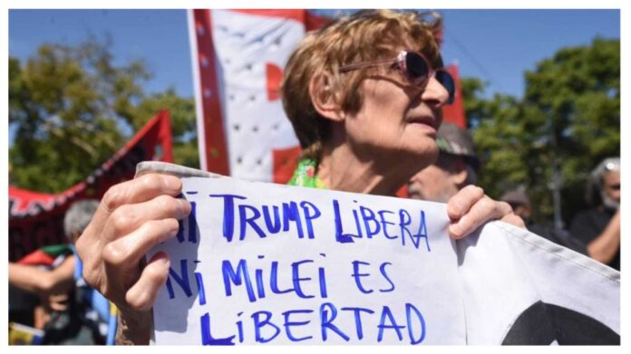 La concentración, que comenzó en Plaza Italia, se dirigió a la sede diplomática estadounidense. Slogans como “Ni Trump libera, ni Milei es libertad” y “Váyanse al carajo yankis de mierda” resonaron en las pancartas, reflejando un fuerte sentimiento de oposición.