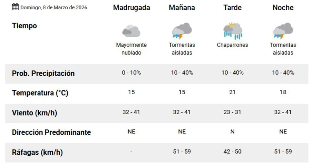 El domingo 8 de marzo continuará con la inestabilidad climática. La mañana comenzará con 15 grados y un cielo nublado, con la posibilidad de tormentas aisladas. En la tarde, se esperan chaparrones y una temperatura máxima de 21 grados, mientras que el viento puede variar entre 42 y 59 kilómetros por hora durante todo el día.