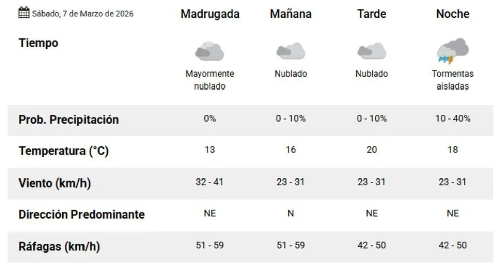 El sábado 7 de marzo comenzará con una temperatura de aproximadamente 13 grados. Las ráfagas de viento, que oscilarán entre 51 y 59 kilómetros por hora, se sentirán durante la madrugada. A medida que avance el día, el termómetro ascenderá hasta los 16 grados, mientras el cielo permanecerá mayormente cubierto.