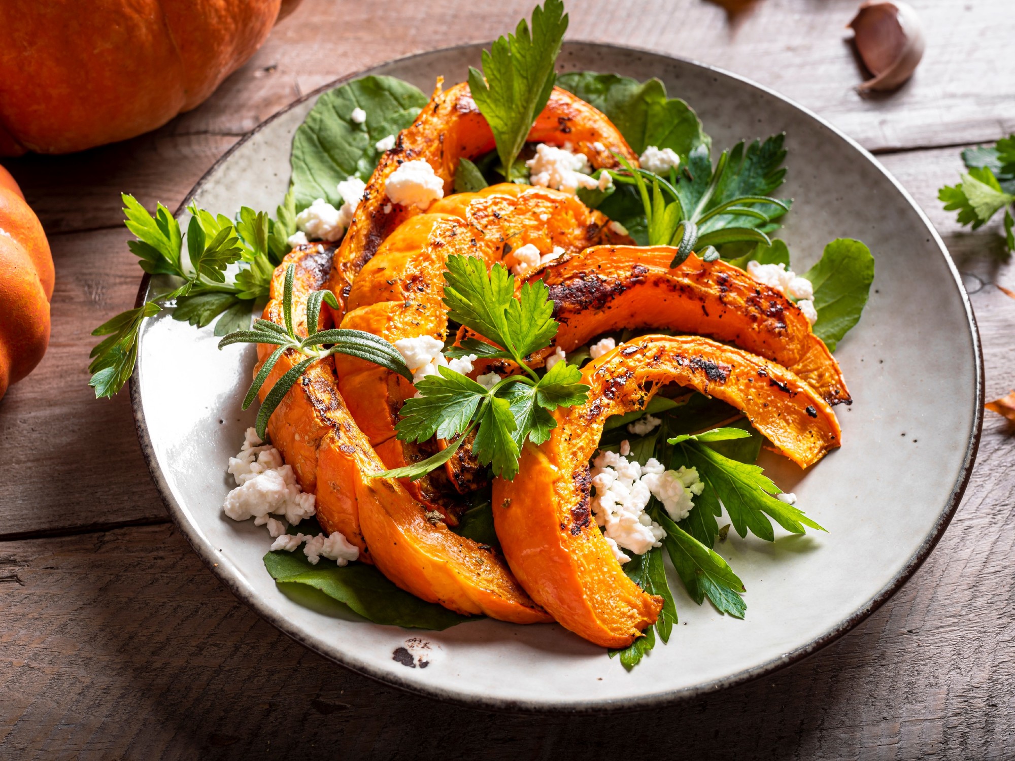 Disfruta de una ensalada que combina la calabaza asada con hojas verdes y queso, ideal para los días frescos. Funciona como entrada o plato principal liviano.