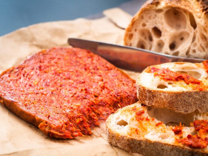 La nduja es un embutido calabrés, elaborado con cerdo y peperoncino, famoso por su textura untable y su sabor picante. En lugar de cortarse en rebanadas, se extiende sobre el pan, convirtiéndose en la estrella de muchos platos.