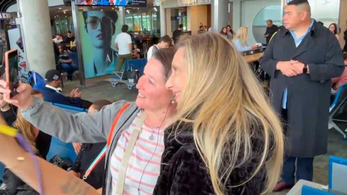 En un momento del viaje, una mujer de Santa Fe se acercó a Karina, agradeciéndole mientras posaban para una fotografía. Las sonrisas y el entusiasmo eran evidentes, transformando el aeropuerto en un punto de encuentro entre la política y la ciudadanía.