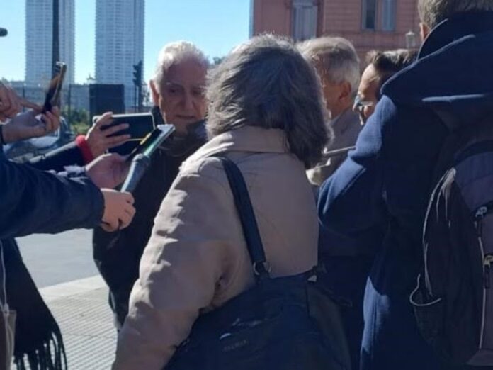 El arzobispo Jorge Lozano se reunió en la Plaza de Mayo con los periodistas acreditados en un gesto de apoyo tras la decisión del gobierno de clausurar la sala de prensa de la Casa Rosada.