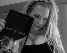 encantos, con un escueto top negro, y sosteniendo un libro sobre