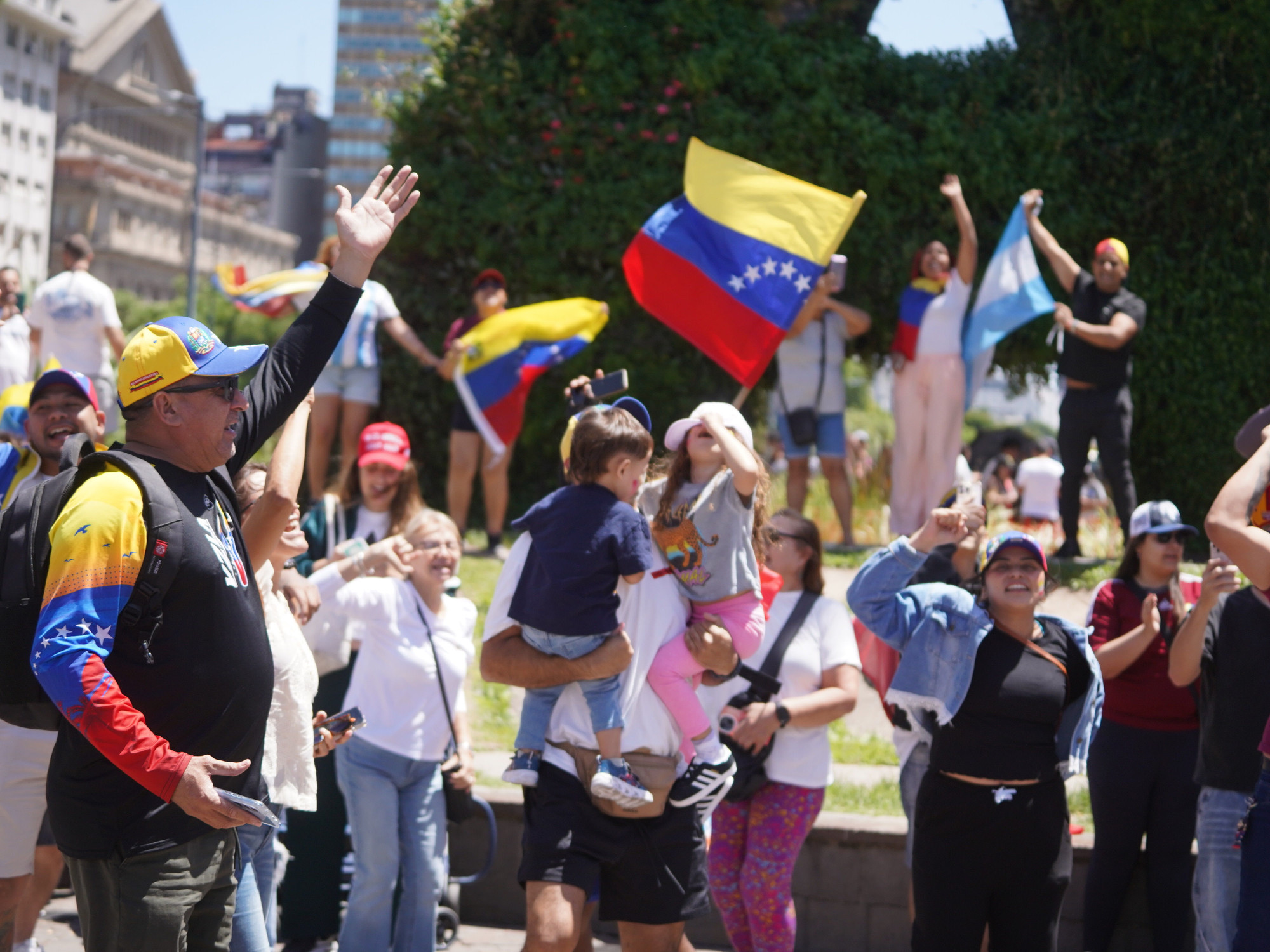 Empujados por la esperanza de un futuro mejor, venezolanos se congregaron en lugares clave de la ciudad. Desde el Centro Venezolano Argentino hasta el emblemático Obelisco, las calles se llenaron de banderas, cánticos y hasta lágrimas de emoción. Para muchos, era el fin de “décadas de sufrimiento”.