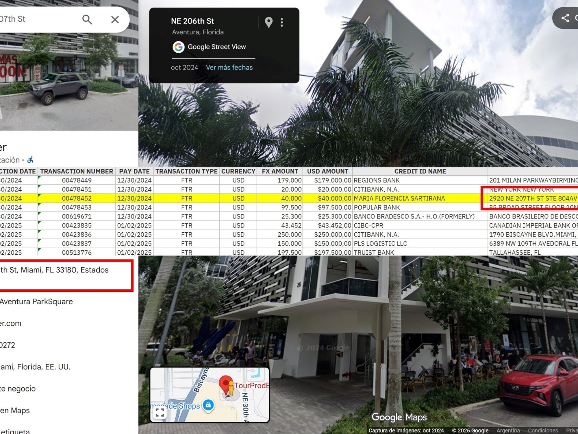 Además, TourProdEnter transfirió 40 mil dólares a María Florencia Sartirana, actual pareja de Toviggino. Curiosamente, los registros indican que esta ex empleada de la AFA tiene como dirección la misma sede de la empresa de Faroni en Miami.