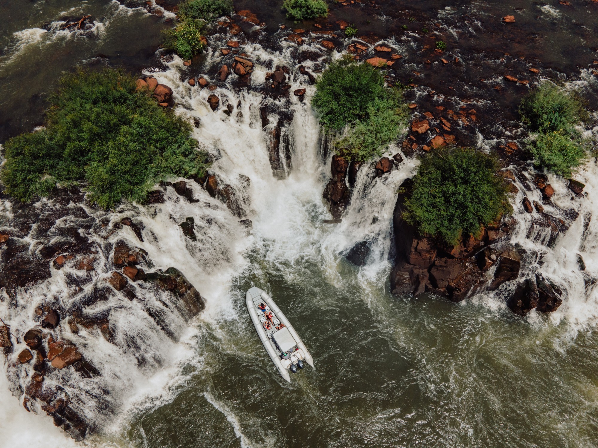Las lanchas se adentran en el río entre bloques de roca, mientras las cascadas se precipitan desde alturas que oscilan entre tres y diez metros, creando un espectáculo que maravilla a todos.