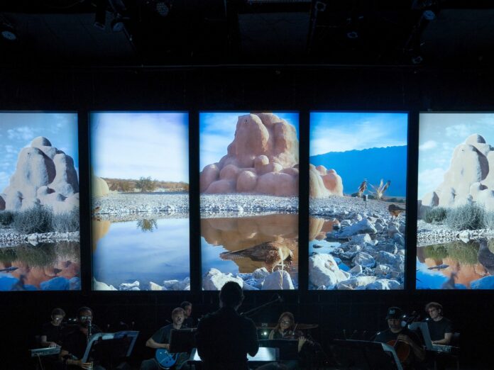Las imágenes proyectadas, caracterizadas por tonos fríos y desaturados, ofrecieron una coreografía mínima y ritual. Los animales se deslizaban en un paisaje áspero y casi post-apocalíptico, creando un mundo donde la vida persiste de manera sutil pero constante.