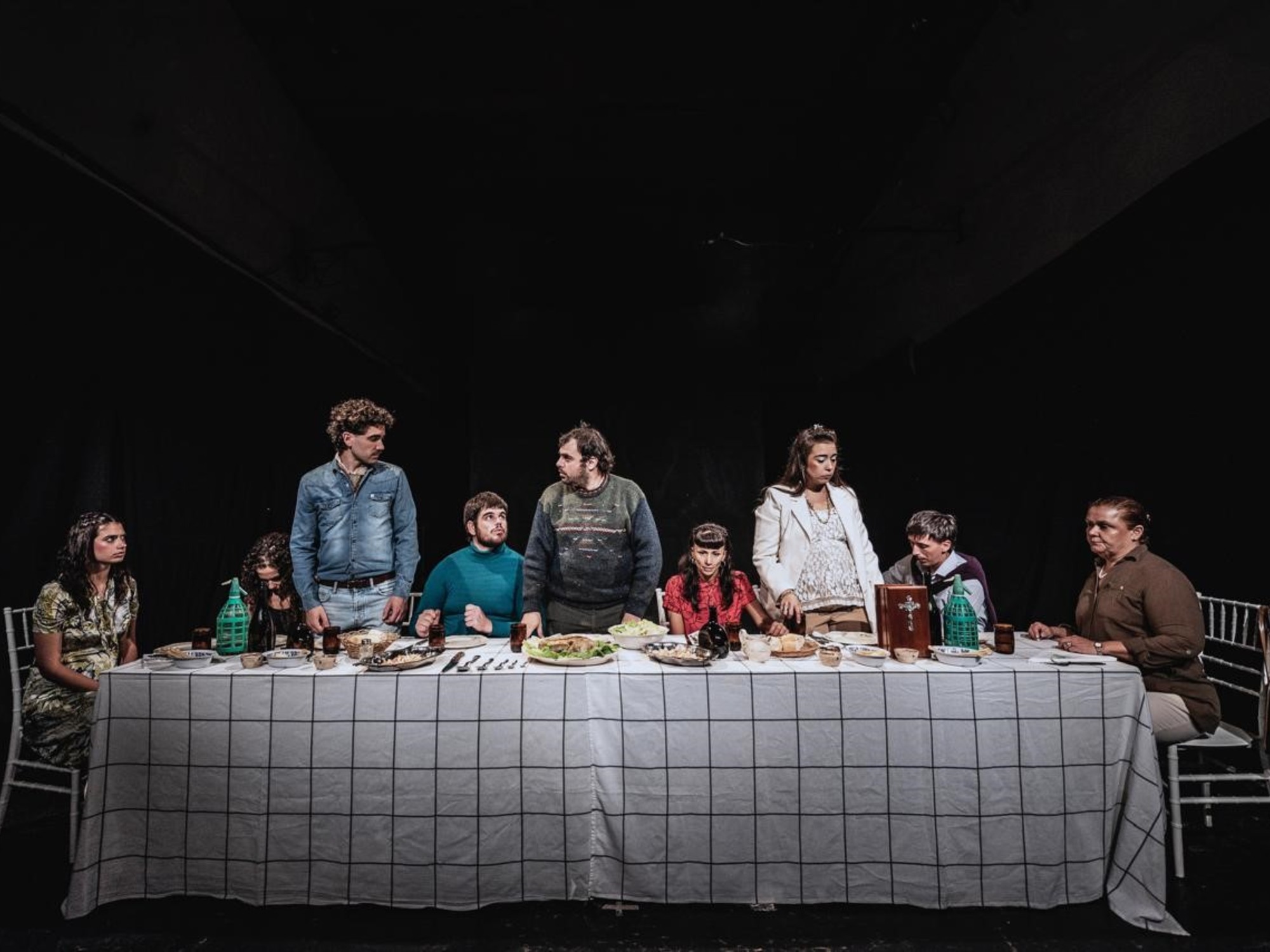 La pieza presenta una mesa larga, donde nueve personajes se reúnen, creando una atmósfera tensa que va en aumento hasta alcanzar su clímax. La obra logra eludir las comparaciones obvias y se sumerge en el análisis de relaciones familiares, mostrando la complejidad de estas interacciones.